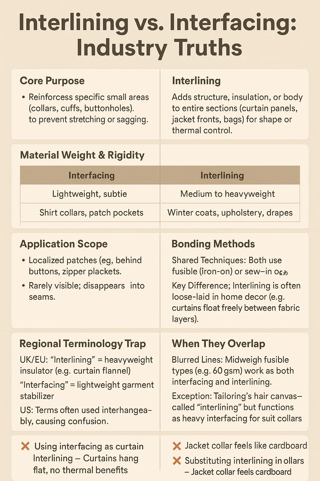 EUA: Termos frequentemente usados de forma intercambiável, causando confusão. Dica profissional: verifique o contexto - "entretela de cortina" sempre significa camada de isolamento.