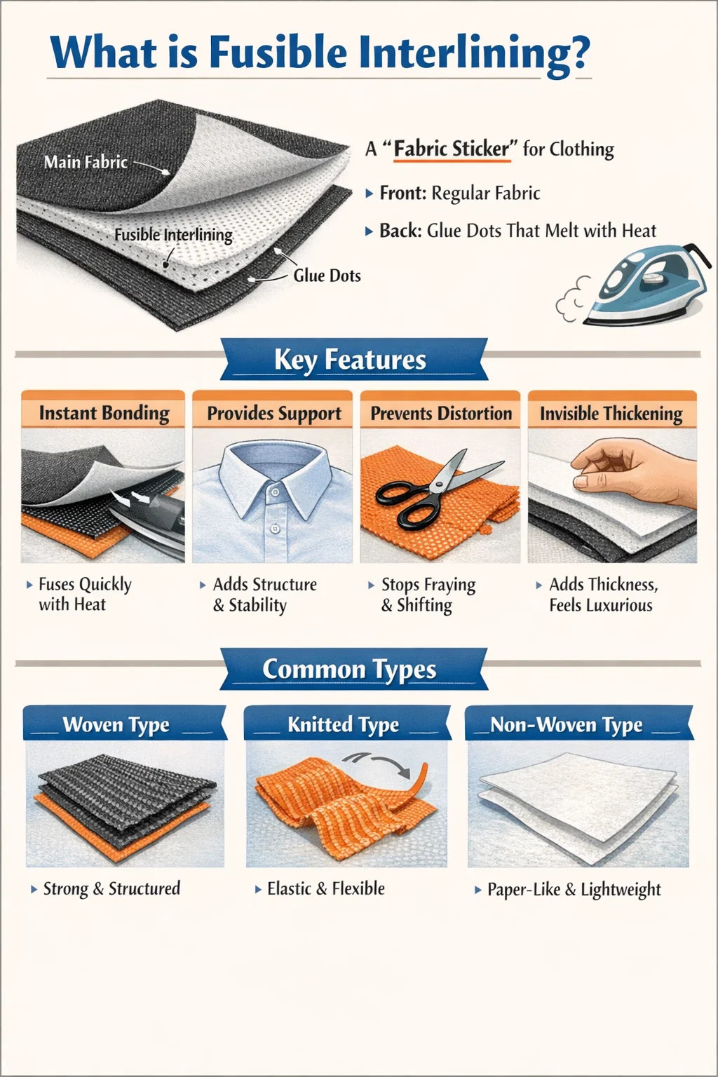 Você pode pensar nisso como um **"adesivo de tecido"**. A frente é feita de tecido comum ou não tecido, enquanto a parte traseira é coberta com pequenas partículas de cola. Esta cola é seca e não pegajosa à temperatura ambiente, mas derrete quando aquecida.
