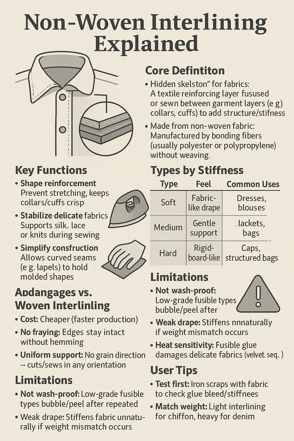 "Esqueleto oculto" para tecidos: uma camada de reforço têxtil fundida ou costurada entre camadas de vestuário (por exemplo, colares, punhos) para adicionar estrutura/rigidez.