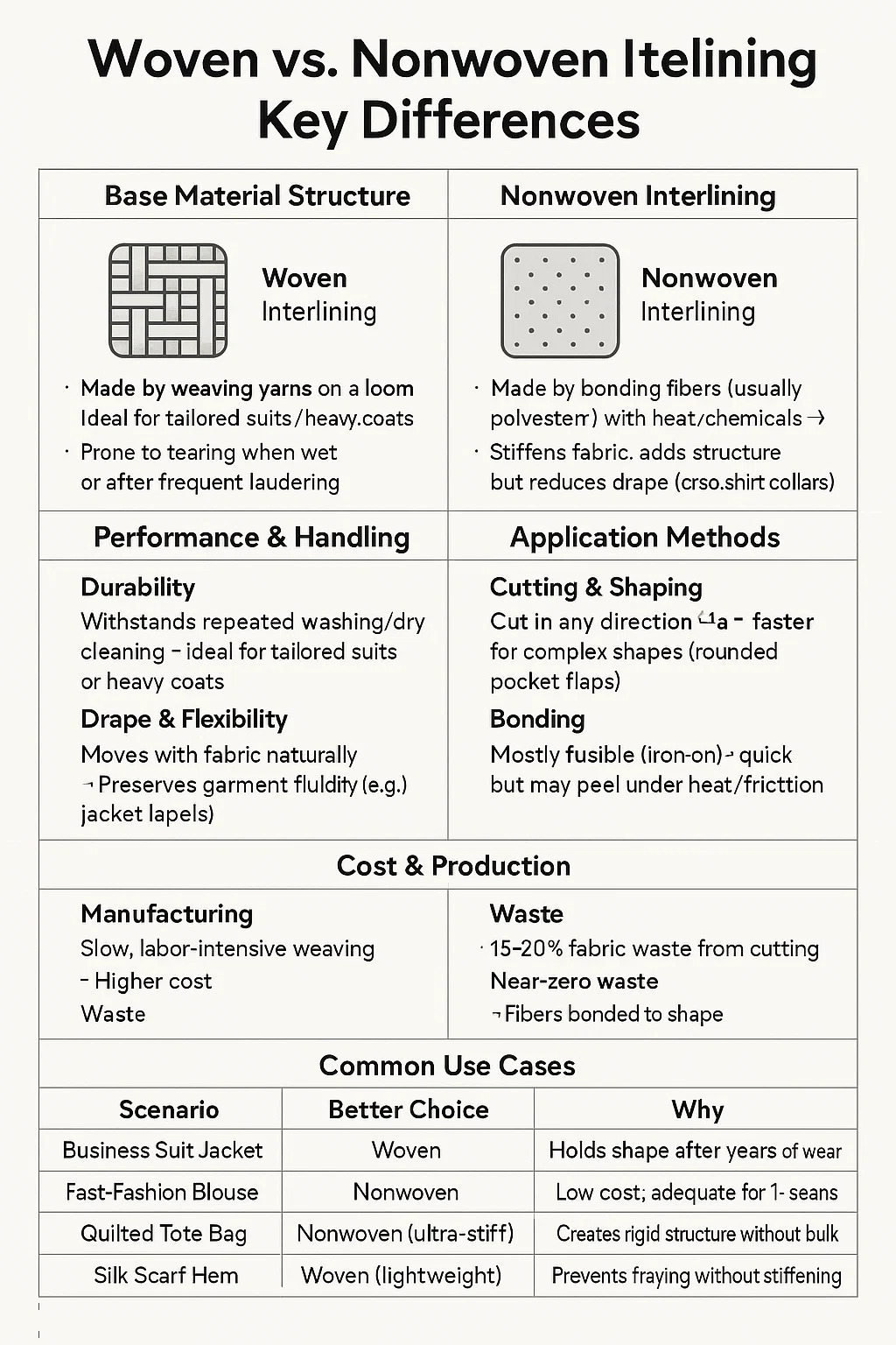Interlining não tecido: fabricado por fibras de ligação (geralmente poliéster ou polipropileno) com calor/produtos químicos → sem direção de grão.