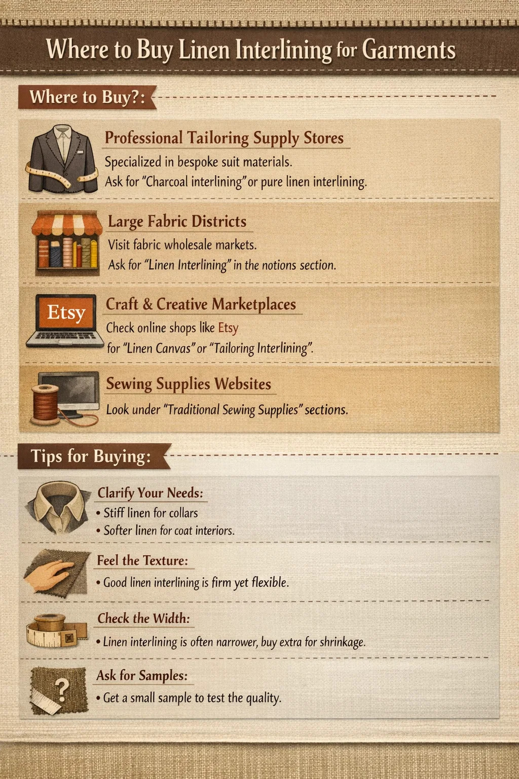 Se você quer comprar roupa de cama entretela ou interface para confecção de roupas, existem várias fontes confiáveis que você pode explorar. Como o linho é um material relativamente sofisticado usado em ternos sob medida e roupas prontas para vestir de alta qualidade, você precisará procurar em lojas especializadas de tecidos.