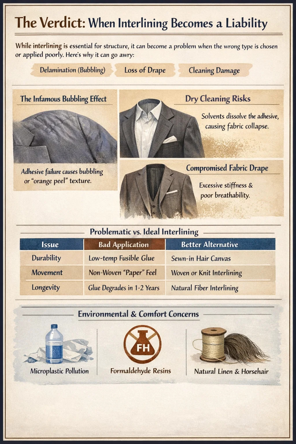 Para ser claro, entretela não é inerentemente ruim ; na verdade, é essencial para a estrutura. Porém, torna-se “ruim” quando o tipo errado é escolhido ou quando é mal aplicado. As principais razões pelas quais uma entretela específica pode ser considerada prejudicial para uma peça de roupa incluem delaminação (borbulhamento) , um perda de cortina natural , umnd reações adversas à limpeza . Quando a ligação entre a entretela e o tecido frontal falha, cria-se um dano estético permanente que não pode ser revertido.